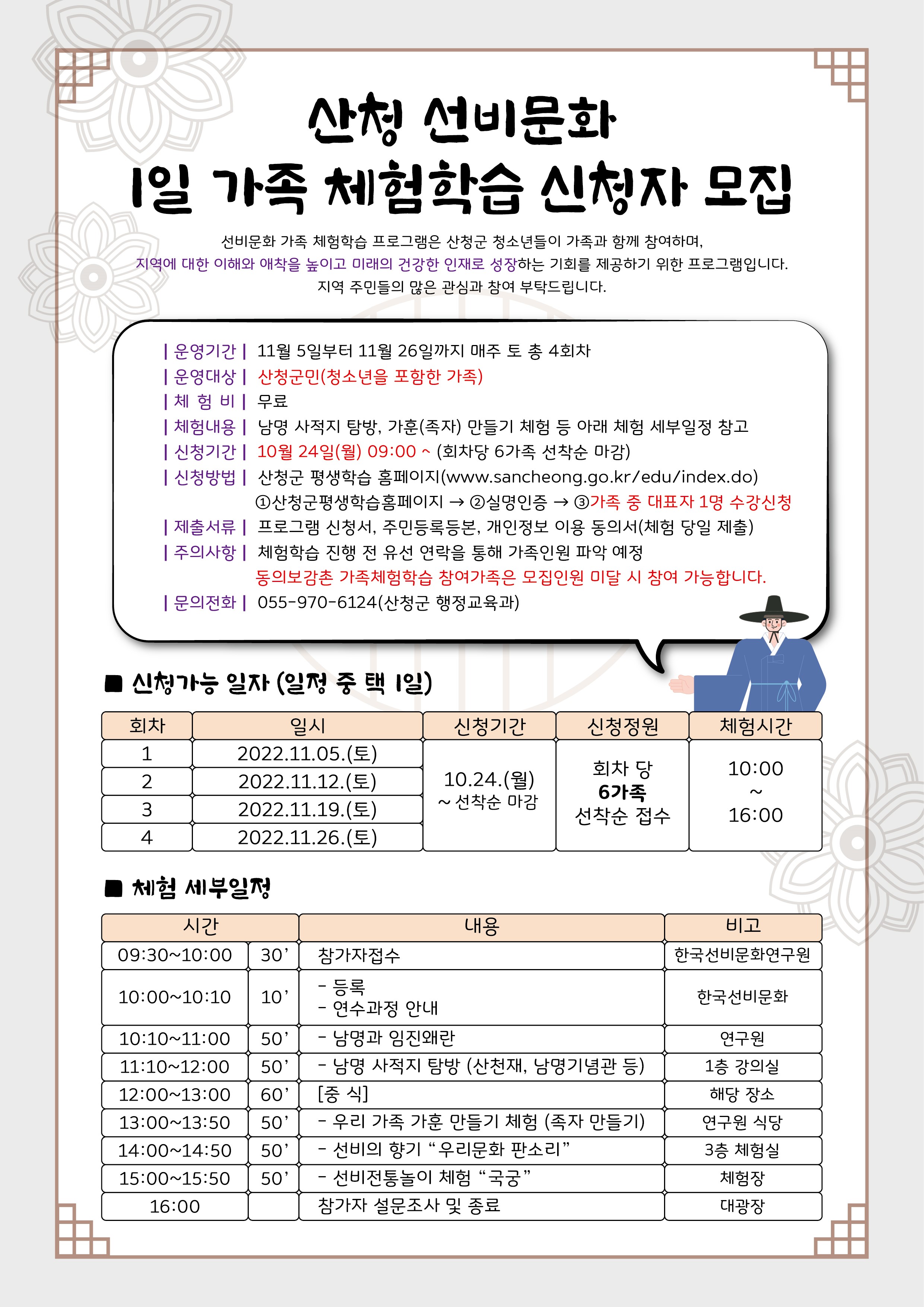 산청 선비문화 1일 가족 체험학습 신청자 모집 신청기간 연장 안내